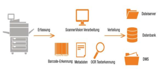 Scannervision funciona como un puente entre tu impresora multifunción con escáner y la base de datos que tiene tu compañía. En concreto, colabora en la conversión automática de los documentos en el formato más conveeniente, enrique los documentos con datos críticos y los almacena en el lugar idóneo.